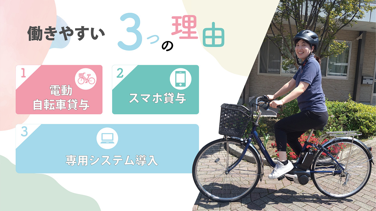 | 応募資格 | ▼必須資格(下記いずれか) ・介護福祉士 ・実務者研修(ヘルパー1級、基礎研修) ・初任者研修(ヘルパー2級) ▼必須要件 ・自転車に乗れる方 ※電動自転車が初めての方も最初は練習してからスタートするのでご安心ください! ※訪問介護の経験がなくてもOK! |