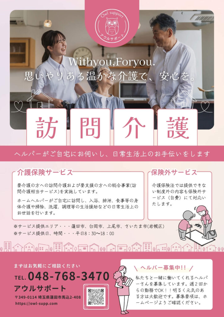 | 給与備考 | ・身体介護:1800円/60分 ・生活援助:1400円/60分 ・総合事業:1400円/60分 ※同行研修時は1300円/60分となります |