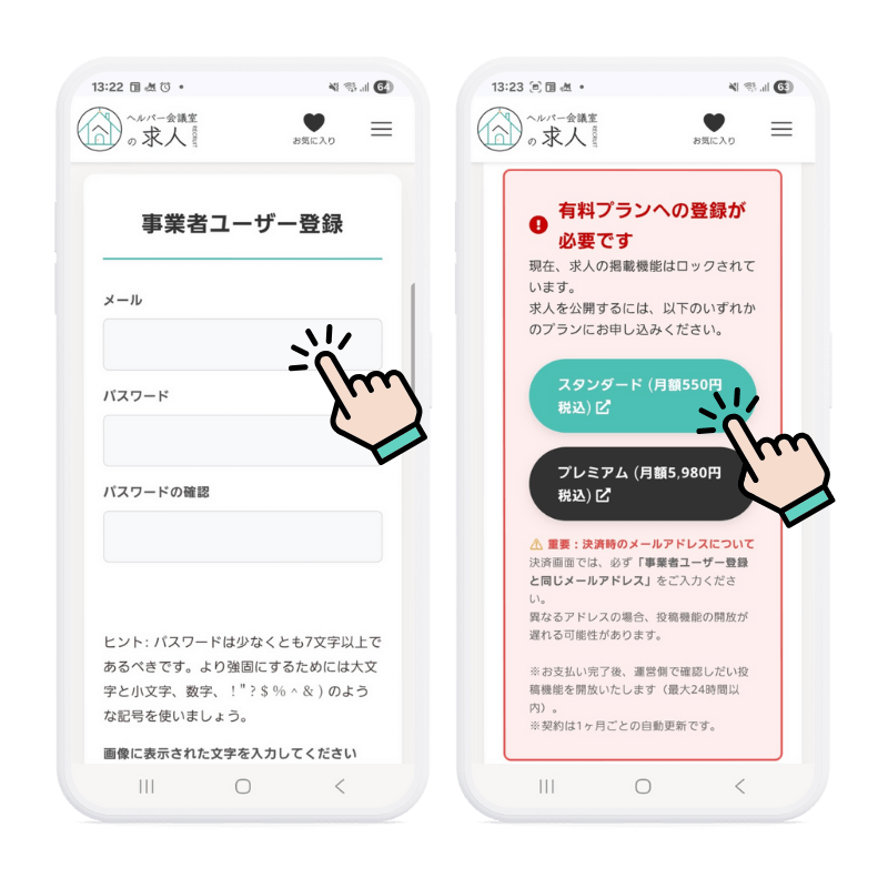 事業者ユーザー登録→プラン選択および料金のお支払い→求人情報の入力・作成→求人の申請・審査→掲載開始・応募の受付の流れとなります。