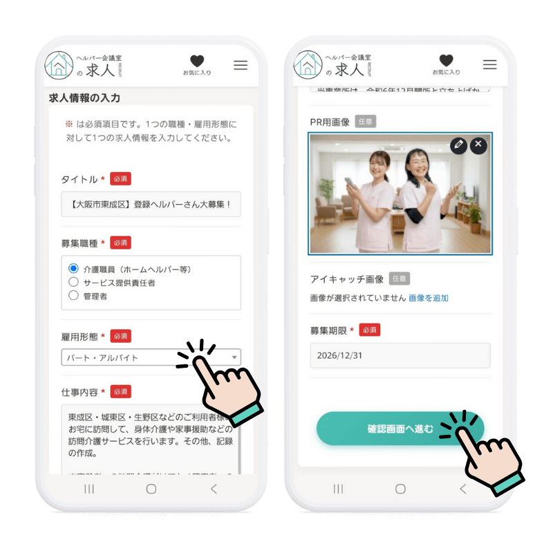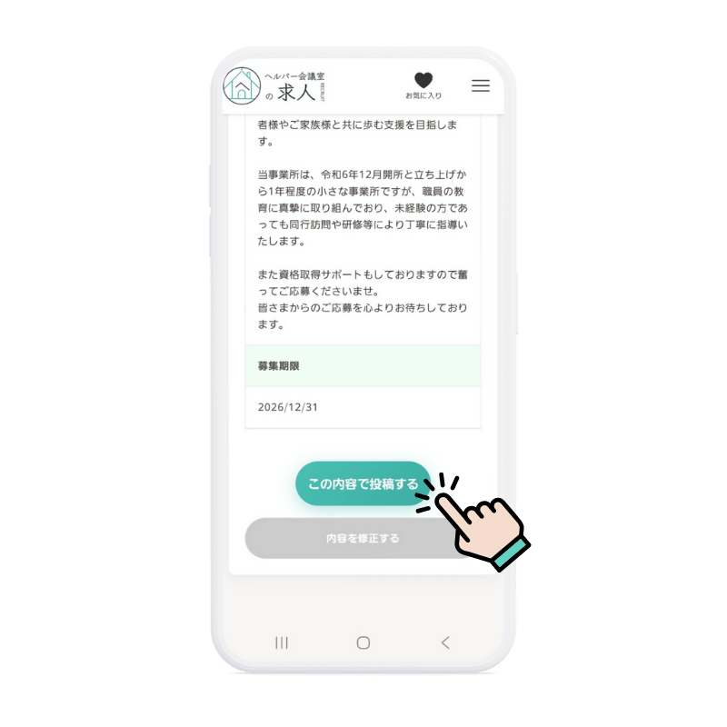 入力が終わったら投稿ボタンを押して完了。運営部で確認後、最短即日であなたの求人が公開されます。公開後は、事業者マイページから編集・停止・削除など求人の管理が可能です。